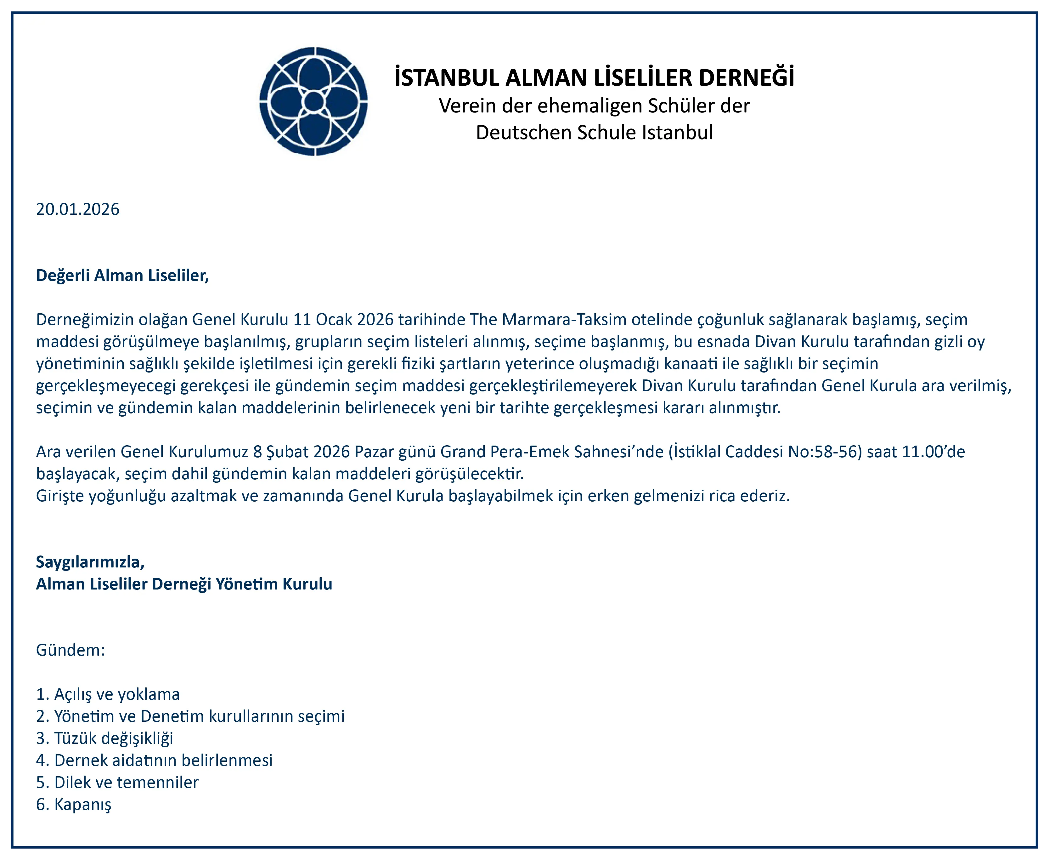 Sevgili Alman Liseliler, Uzun bir aradan sonra sizlere tekrar merhaba diyebilmenin mutluğunu yaşıyoruz. Tüm dünyayı ve doğal olarak ülkemizi de fazlasıyla etkileyen; yaşam biçimlerimizi, alışkanlıklarımızı değiştirmemize neden olan pandemi sürecinde bir araya gelme fırsatımız olmadı. İletişimin ağırlıklı olarak on-line olarak gerçekleştiği yeni düzenimizde, dernek web sayfamız dijital ortamda kendimizi daha iyi ifade edebileceğimiz, iletişimimizi daha kuvvetli kılacağımız bir platform. Bu platformu daha güçlü kılmak sizlerin elinde. Geçmişten günümüze anılarınızı, fotoğraflarınızı burada p ...