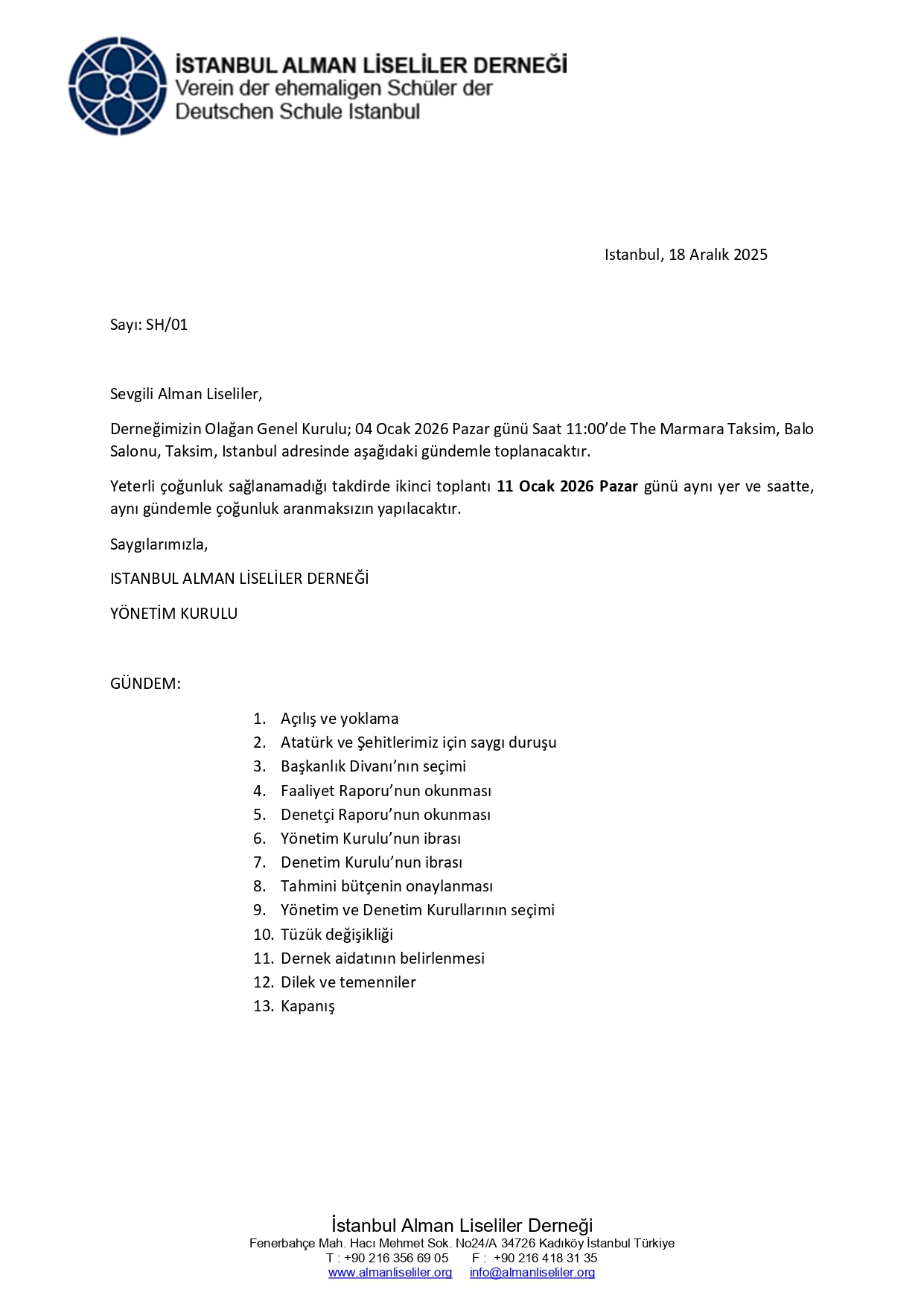 Sevgili Alman Liseliler, Derneğimizin Olağan Genel Kurulu; 04 Ocak 2026 Pazar günü Saat 11:00'de The Marmara Taksim, Balo Salonu, Taksim, İstanbu [...]